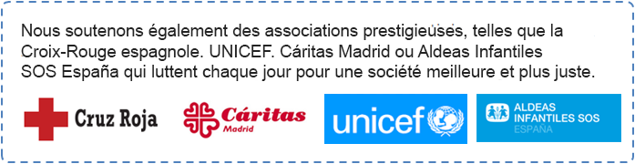 Nous soutenons également des associations prestigieuses telles que : UNICEF, Croix-Rouge espagnole, Cáritas Madrid et Aldeas Infantiles SOS España.